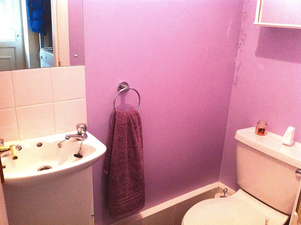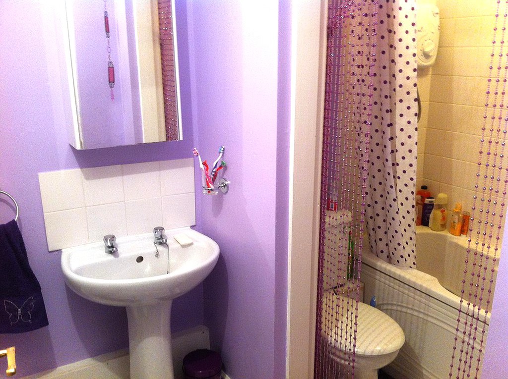 Main Bathroom with white 3 peice bathroom suite of WC, washbasin, bath with shower above. Heated towel rail. Fitted cupboard with plumbing for Washerdryer.