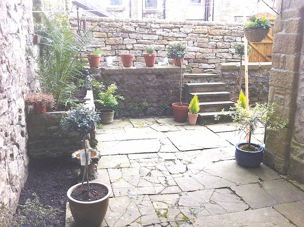Rear Patio Garden with stone flagged area and flower boarders. Raised planter and raised seating area to take full advantage of the available sun.
